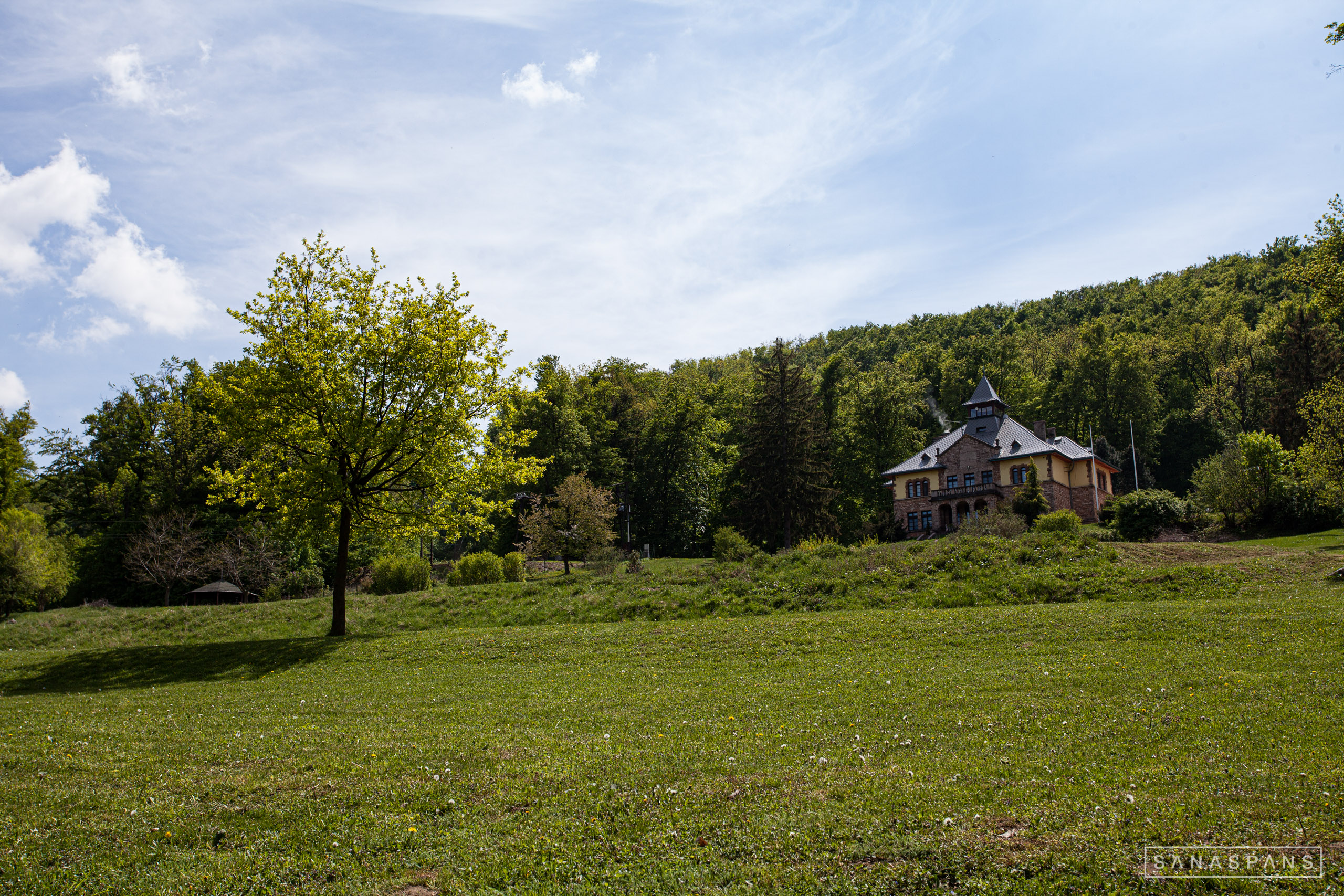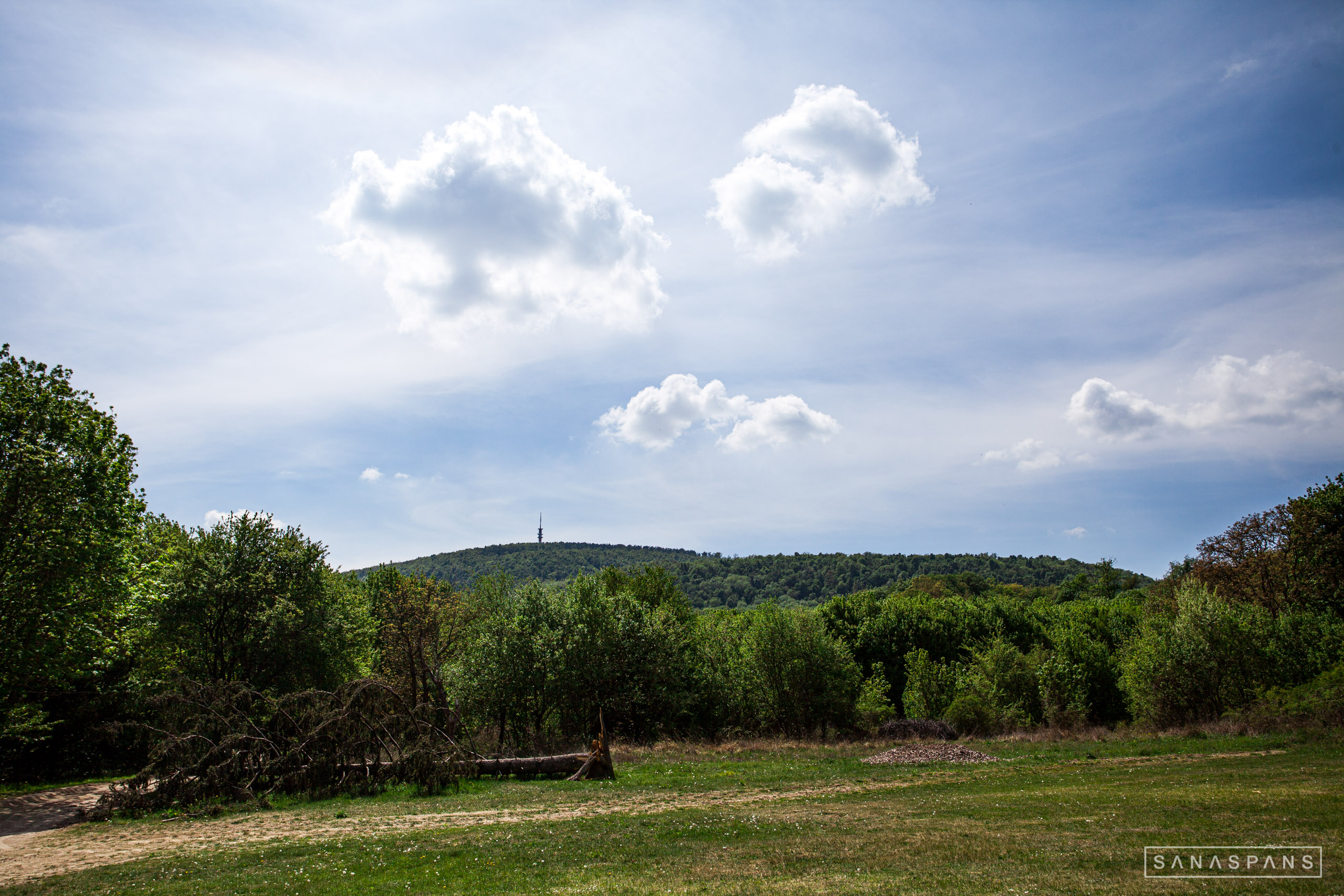 Szárliget vasútállomásról reggel 9-kor indulva nem egészen másfél óra alatt felértem a Somlyó tetejére, ahol egy nem éppen korszerű kulcsosház áll. Nem tudom, hogy még látogatható-e, de meglehetősen lerobbant állapotban van. Az út Szárliget határából a Nagyegyháza környéki szakasz kivételével erdőben megy, normál erdészeti úton, egy-két szép szántót kivéve nem sok látnivalót nyújt.